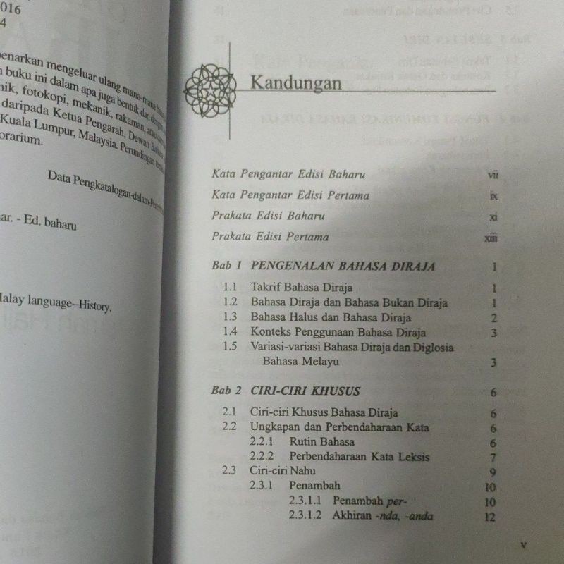 Adinda Ahmad Shah akhiran Alam Ampun Tuanku. 1 Bilik Maha Suci. Buku setebal 58 halaman ini dibahagikan kepada lima bab utama iaitu Pengenalan Bahasa.