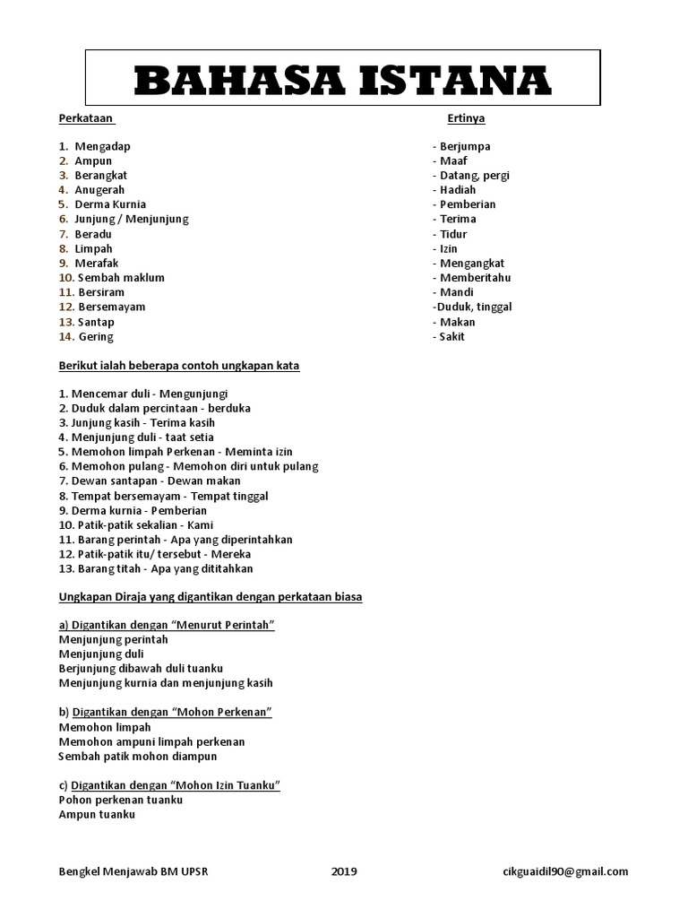 Ini kemudiannya disusuli pada tahun 1895 kepada pembacaan tajuk dan memorandum tujuan Akta sahaja dan sejak 1988 hanya tajuk pendek dan ringkasan tajuk panjang dibaca. Posted by Cikgu Fzli at 0434. Bahasa istana ialah bentuk bahasa yang digunakan di kalangan kerabat diraja apabila berhubung dengan kerabat diraja dan apabila menyebut hal-ehwal berkenaan raja dalam sesetengah bahasa baik masih digunakan hari ini mahupun tinggal sejarah.