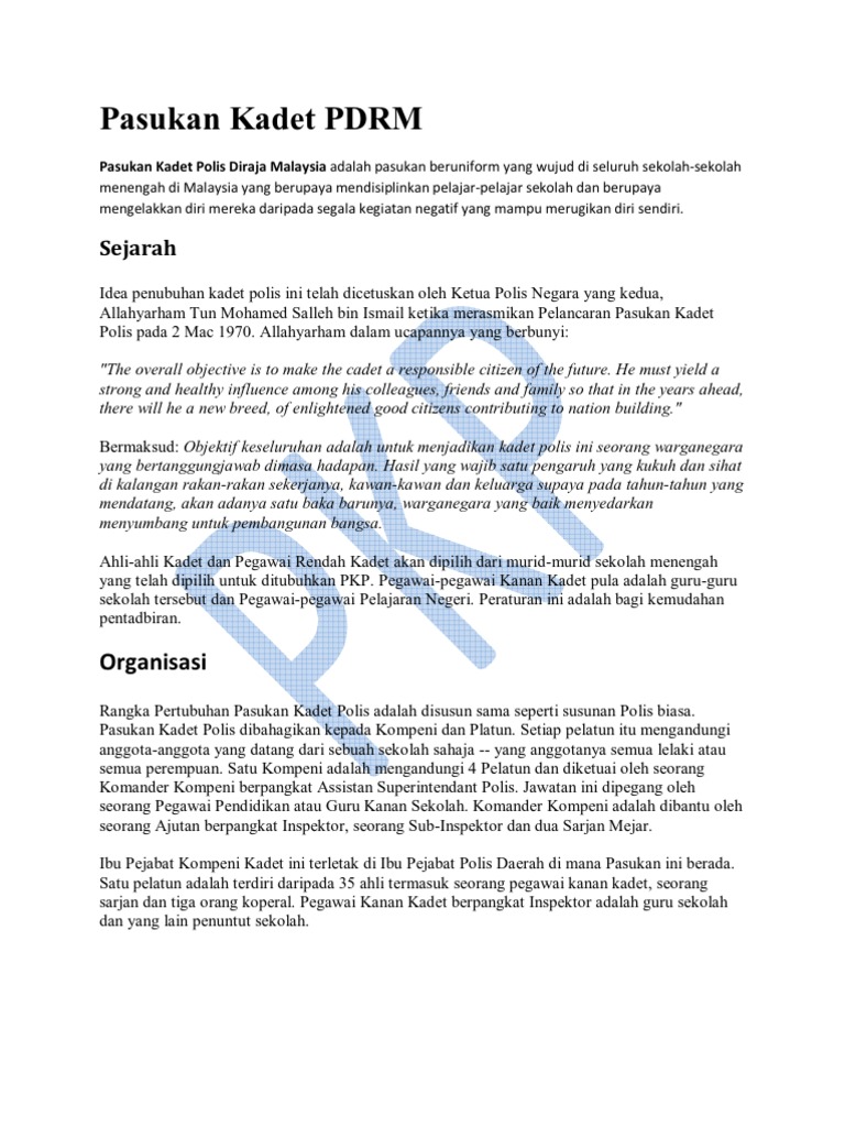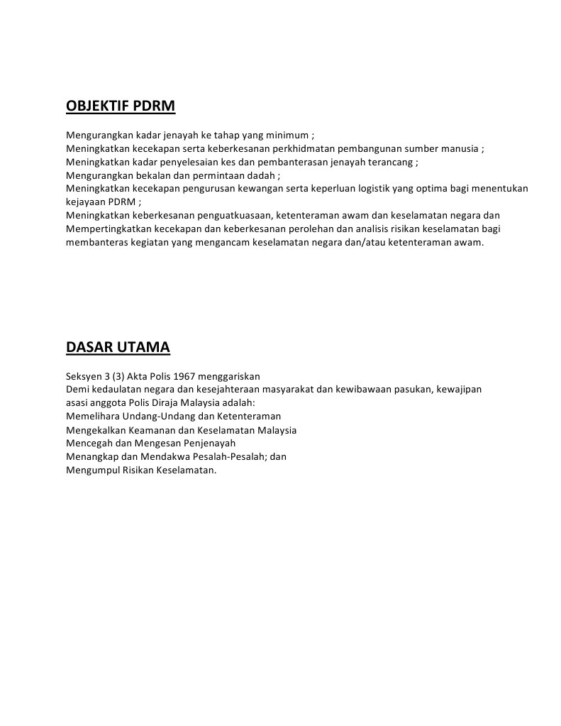 Objektif polis diraja malaysia. Scribd es red social de lectura y publicacin ms importante del mundo. 2782012 Pasukan Kadet Polis Diraja Malaysia adalah pasukan beruniform yang wujud di seluruh sekolah-sekolah menengah di Malaysia yang berupaya mendisiplinkan pelajar-pelajar sekolah dan berupaya mengelakkan diri mereka daripada segala kegiatan negatif. Memastikan perkhidmatan dan pentadbiran kewangan yang berkualiti.
